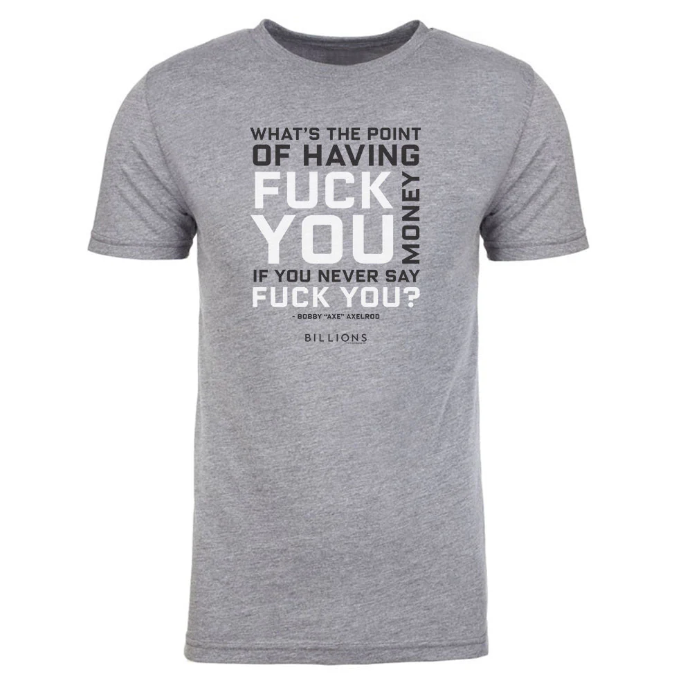 What’s the point of having F*ck You Money if you never say f*ck you? Take Bobby “Axe” Axelrod’s iconic quote to Chuck Rhodes everywhere you go by adding this Billions What's the Point Men's Tri-Blend Short Sleeve T-Shirt to your wardrobe. Buttery-soft and featuring a block quote design, this tee is a unique addition to your style.